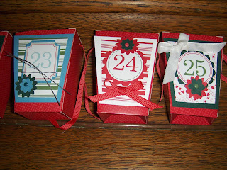 Now this I'll have a hard time letting go of... it's the new Christmas Advent kit in the current Holiday catalog. I purchased it back in September and had never put it together... so it was now or never... well maybe not never but perhaps by December 24th... it's really darling if I do say so myself.... but it took a lot of time to do... it comes with rope and clothes pins to you can hand the boxes from your mantle or doorway. Judee had a great idea just to put them in your tree like ornaments... excellent!