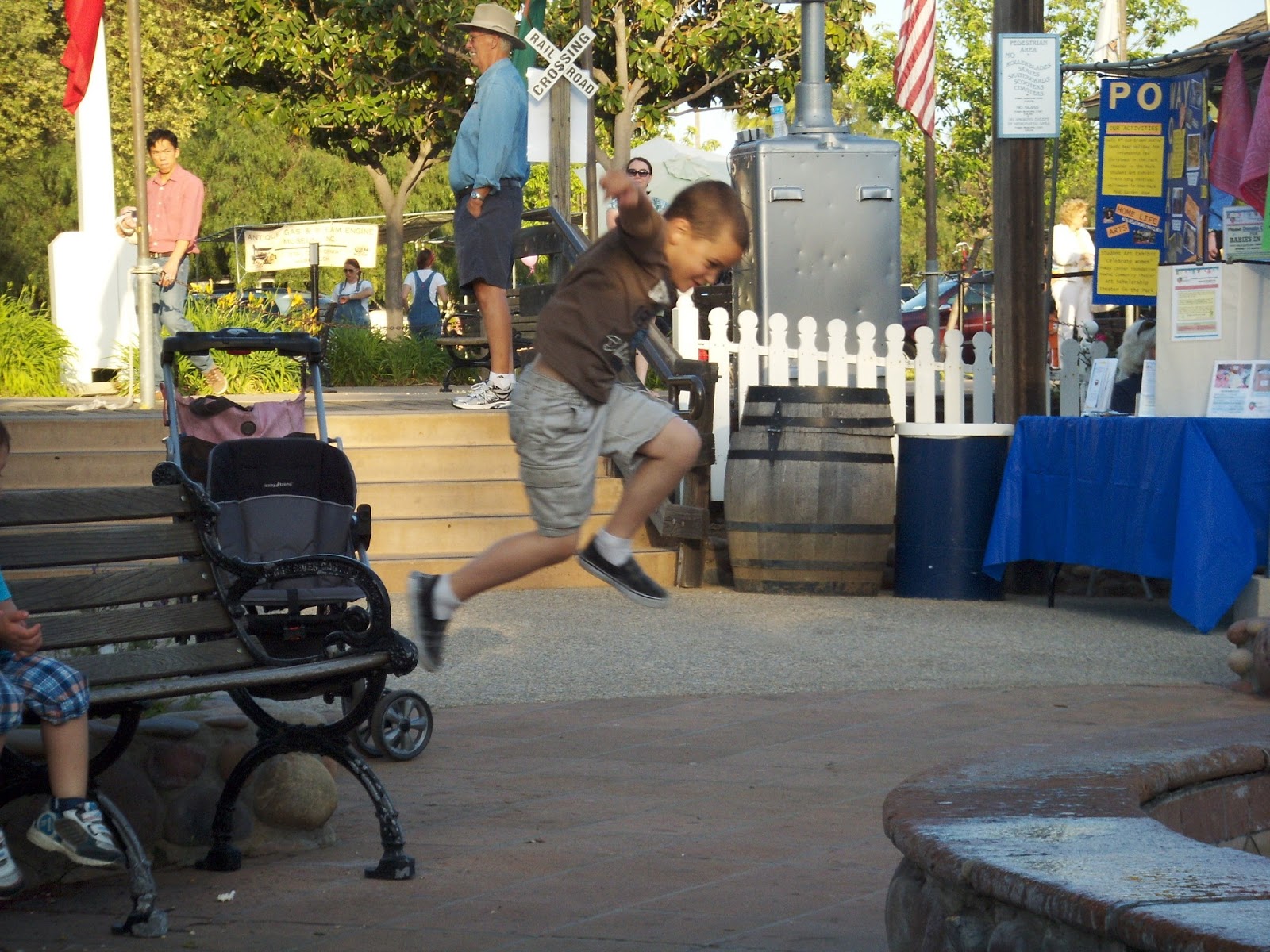 So where did I leave off... oh yea... Brayden and Daniel playing around the fountain....I love it how they create games to do out of nothing... just like the good ol' days... here they are playing Mr. Jumping Beans.... standing on the planter box and jumping across the lines in the tiles... I felt like an Olympic judge wanting to give scores for each jump..... 10.. 10... 10